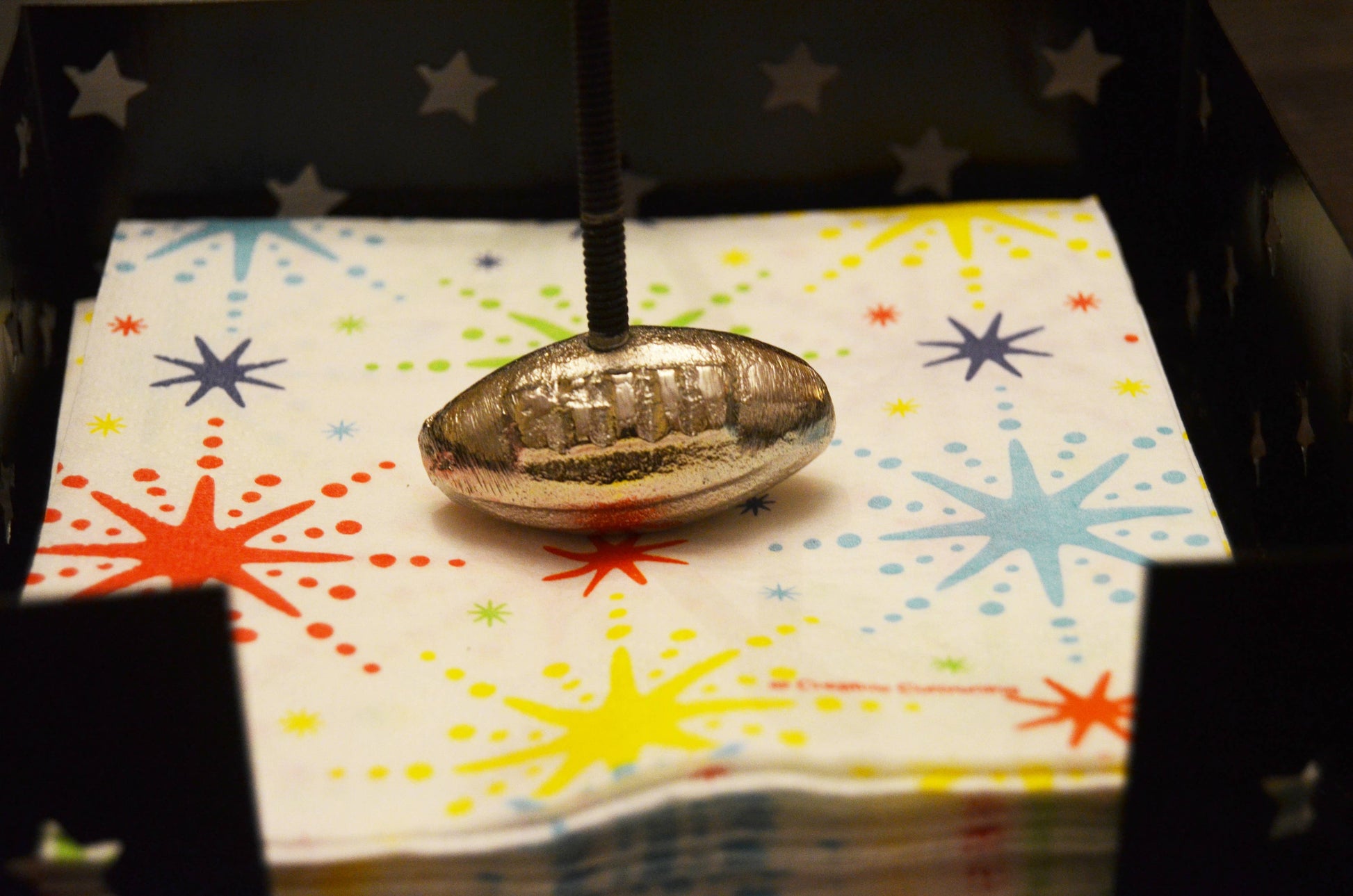 Handcrafted product, made by artisan. 5.8” x 5.2" x 2”, weight around 9.6 oz. Silver antique football is approx 2".